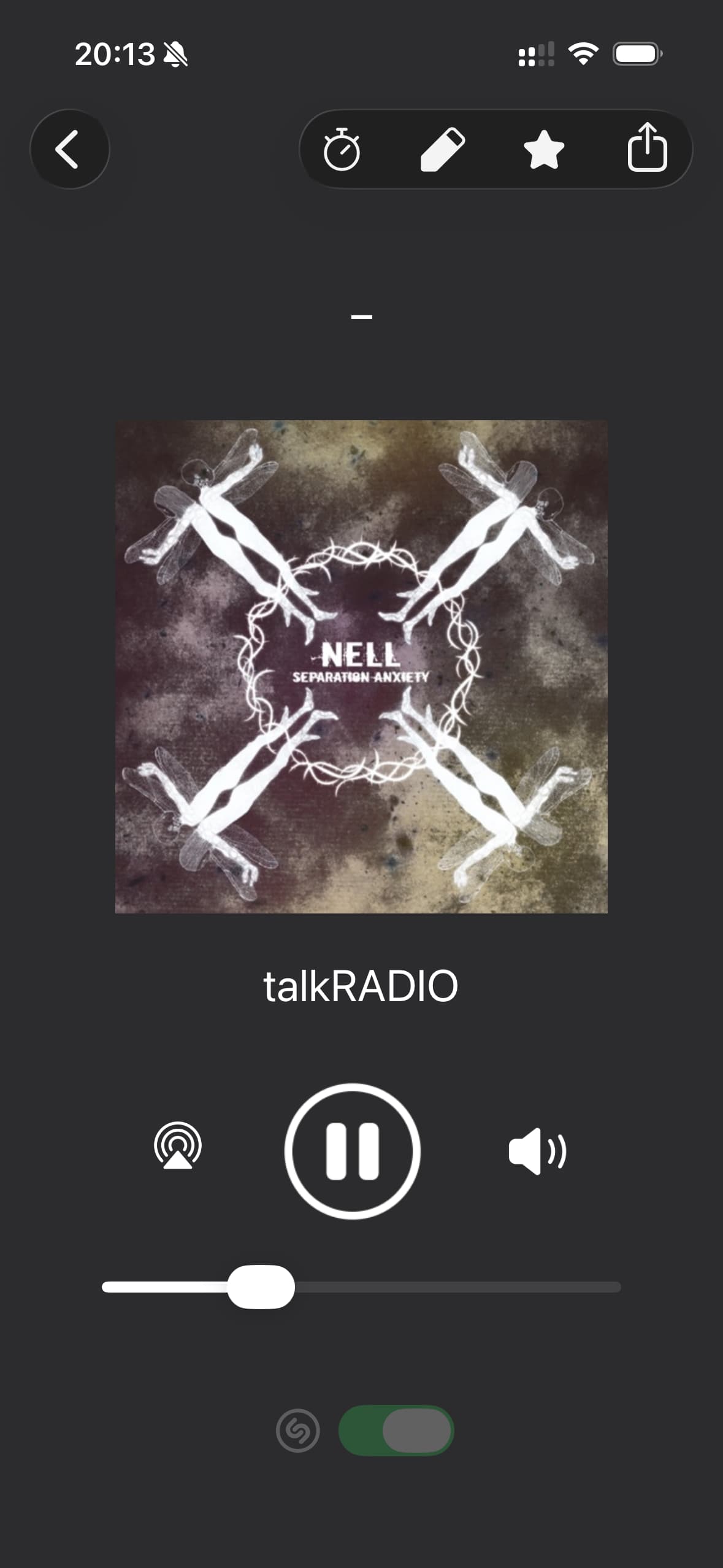 Using Eter to listen to TalkRADIO in the UK. The metadata in the stream has a dash ‘-’ instead of a programme/track name. This causes Eter to retrieve the artwork for (I presume) a track called ‘-’ from Separation Anxiety by an artist called Nell.