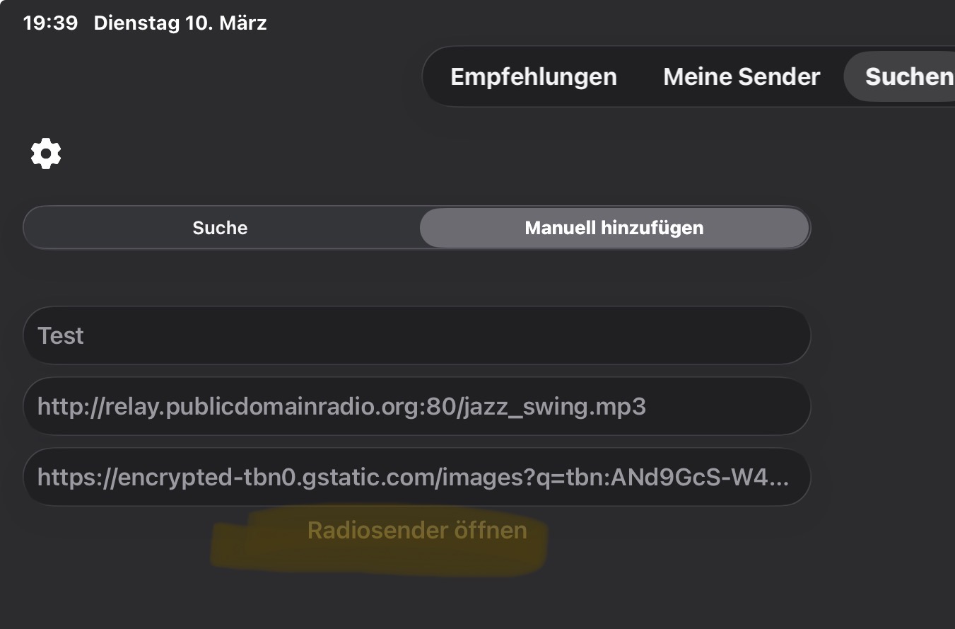 The button „open radio station“ below the 3 fields for inserting name, url and link to logo is disabled.